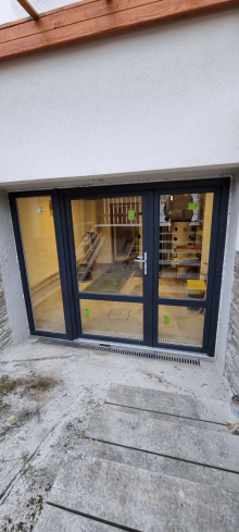Unser Kunde aus Niederösterreich nutzte die Möglichkeit, sich eine dreiflügelige Balkontüranlage nach Maß mit Hilfe des Online-Konfigurators zu entwerfen. Er entschied sich dafür, dass der rechte Flügel festverglast ist, während er bei den übrigen zwei eine öffnungsfähige Ausführung bevorzugte – zusätzlich wurde eine Sprosse ergänzt, die die Tür optisch gliedert und ein interessantes Designelement darstellt. Für die Ausführung wählte er das System REHAU SmartLine+ Classic, das ein hervorragendes Preis-Leistungs-Verhältnis bietet. Innen wollte er die klassische weiße Farbe beibehalten, während er außen eine moderne anthrazitfarbene Oberfläche mit Sandstruktur bevorzugte.